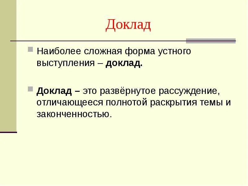 Доклад — это, прежде всего, устное выступление, хотя он может сопровождаться письменным текстом. Его цель заключается в передаче основной информации по теме за ограниченное время и в доступной форме. Доклад ориентирован на аудиторию: одноклассников, студентов, преподавателей или участников конференции. В отличие от реферата, где важна подробность и развернутость, доклад предполагает краткость, чёткость и выразительность.